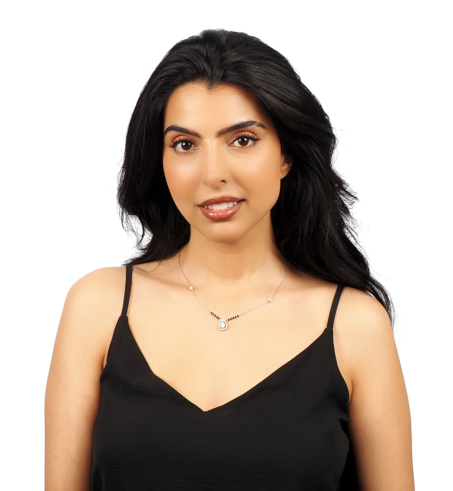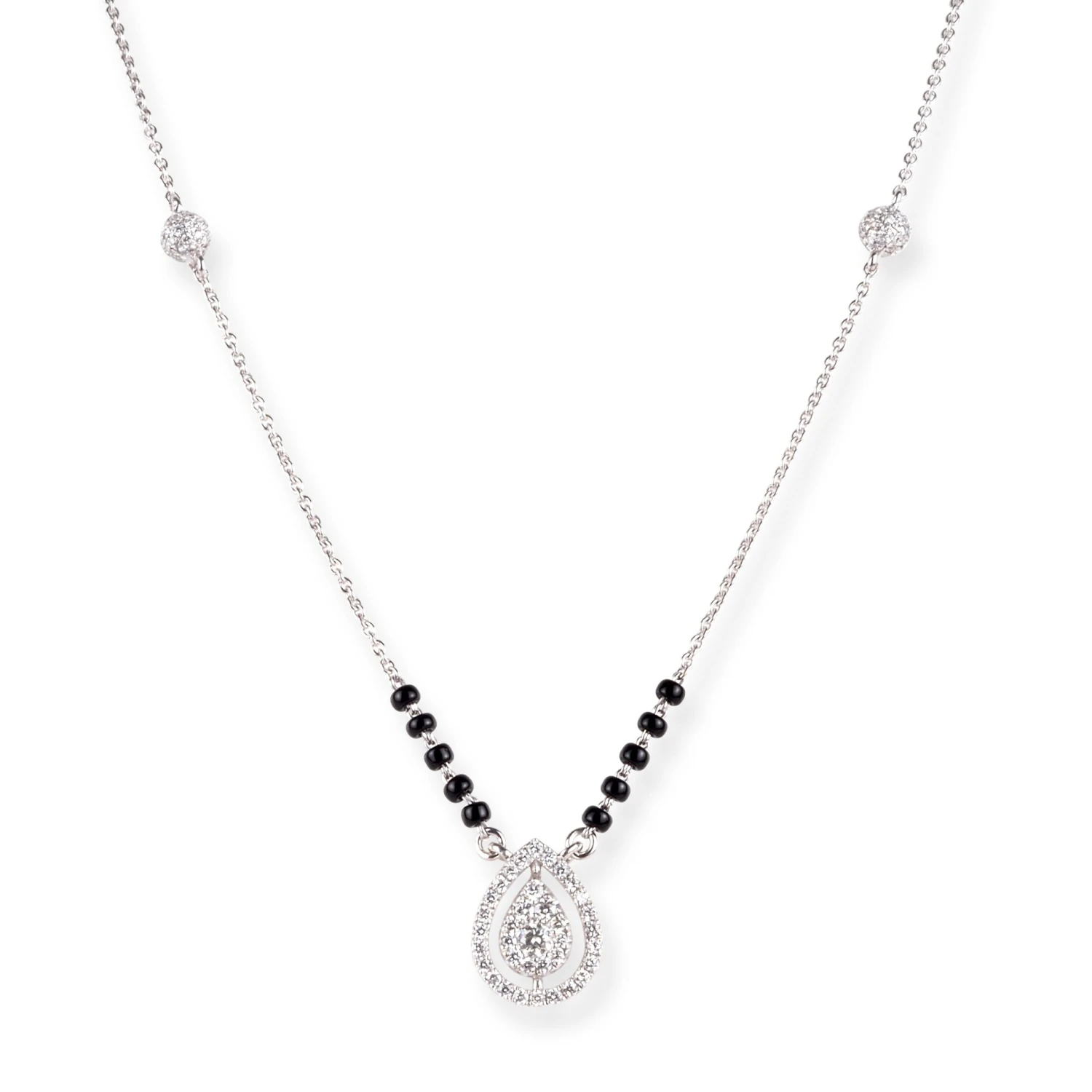 Exquisitely crafted in 18ct white gold, this mangalsutra necklace features a graceful teardrop design set with sparkling diamonds. The elegance of the white gold is beautifully complemented by traditional black beads, creating a harmonious blend of modern style and cultural significance. A timeless expression of love and commitment.