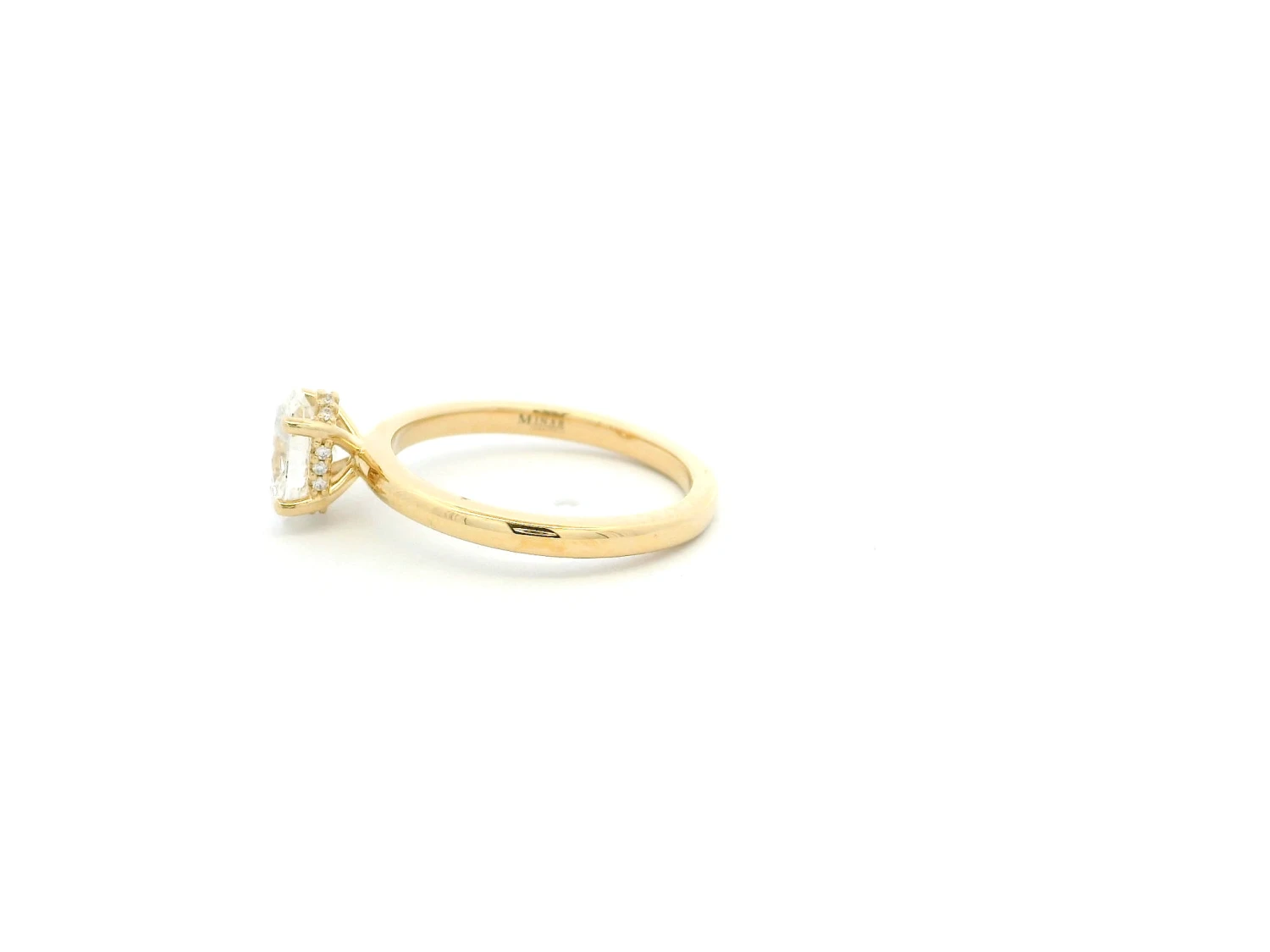 Exquisitely designed, this ring showcases a unique four claw setting. This elegant choice accentuates the striking oval shape of the diamond, allowing it to capture light from every angle. The hidden halo adds a touch of intrigue, with smaller diamonds encircling the base of the primary stone.
