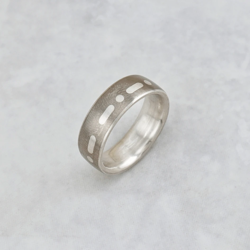 Cette bague unique est gravée selon le message de votre choix en code Morse. Chaque point et chaque trait sont réalisés avec soin pour créer une pièce différente à chaque fois. La combinaison des matériaux crée un contraste saisissant entre la brillance de l’argent et la robustesse du titane, soulignant à la fois l’élégance et la durabilité de la bague.