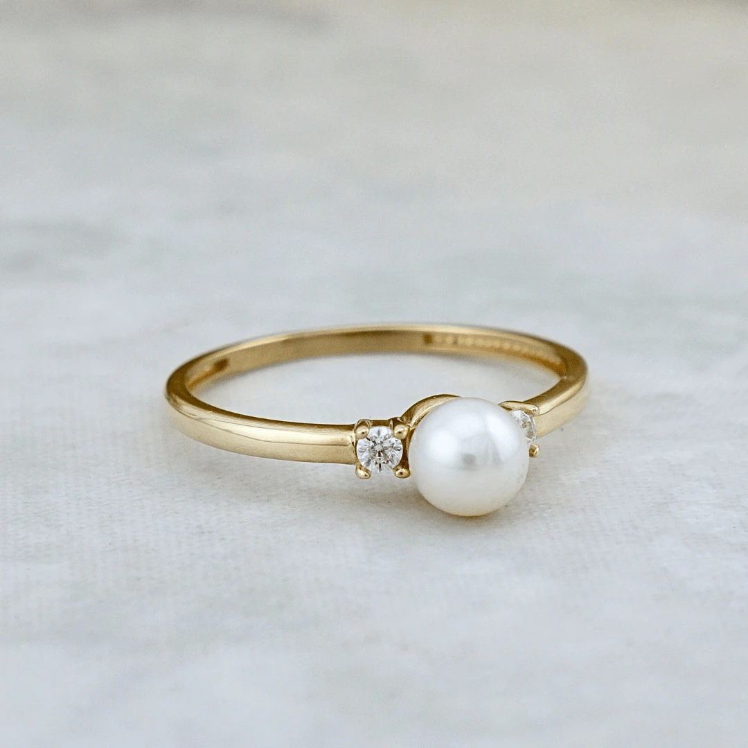 Un classique revisité avec douceur. Cette bague en or 10K met en valeur une perle d’eau douce ronde de 5 mm, accompagnée de deux délicates pierres. Un bijou simple et intemporel.