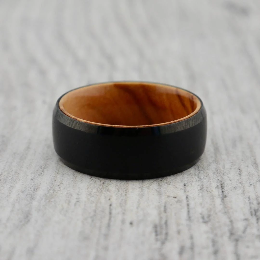 Le bois d’olivier est acheté en bloc, puis tourné sur un tour pour former un anneau. Chaque bague a sa propre empreinte unique de couleur de bois et de motif unique . Le bois d’olivier est un mélange chaleureux et unique qui est lisse et agréable au doigt