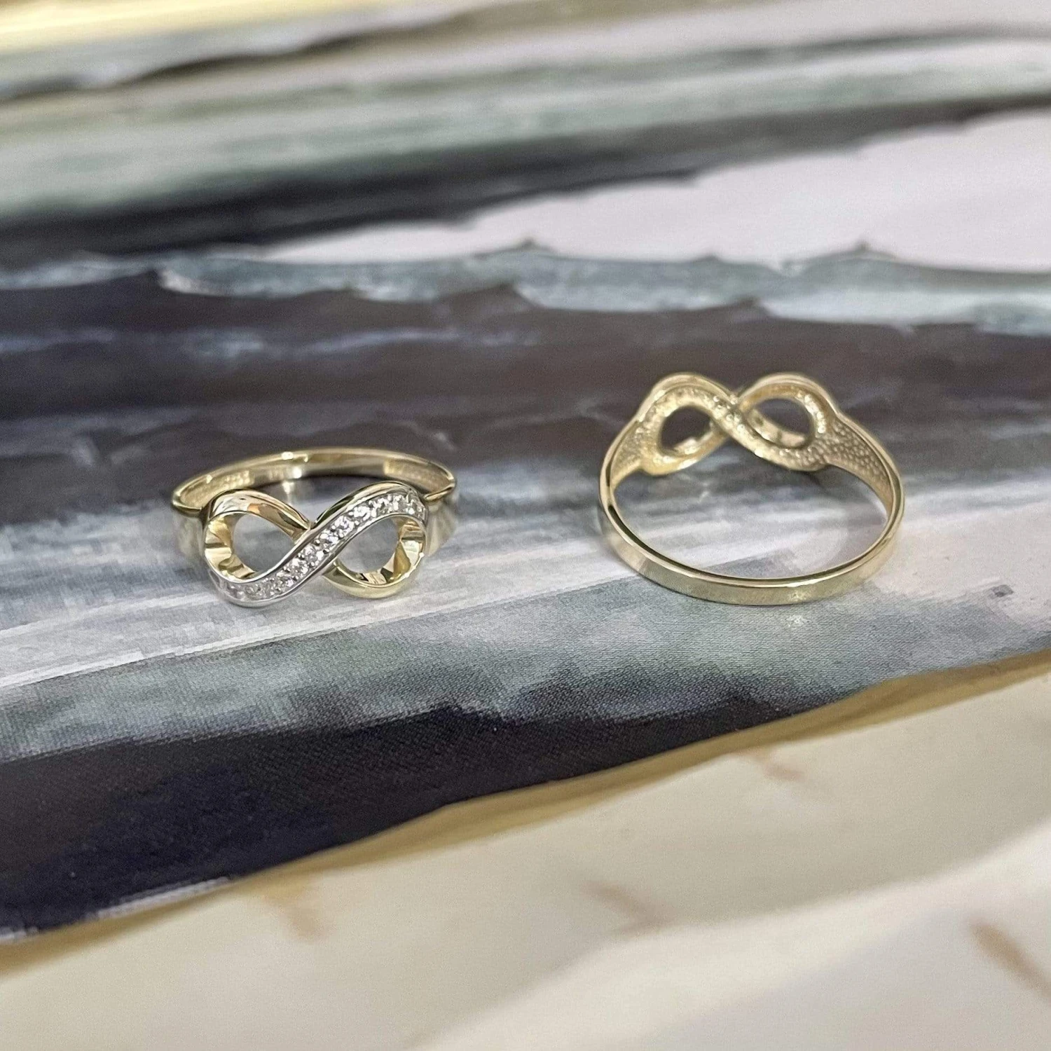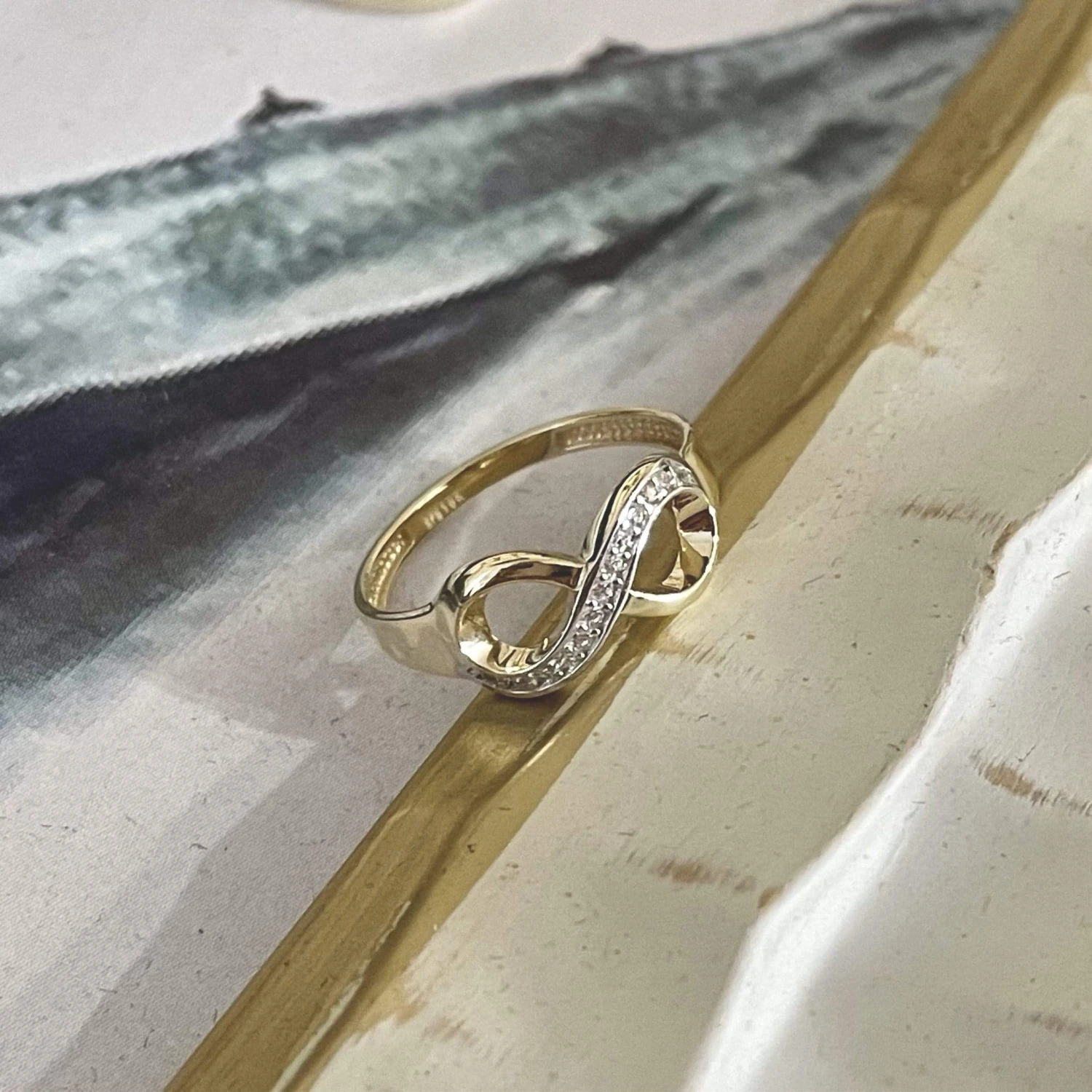 Bague infini en or jaune 10K (accent en or blanc 10K) ou or blanc 10K et zircons cubiques.