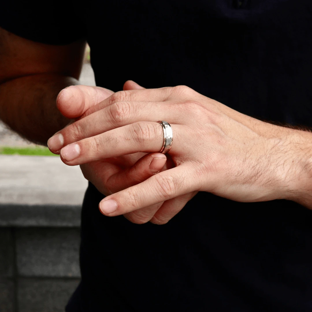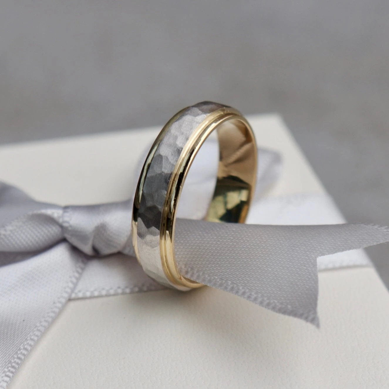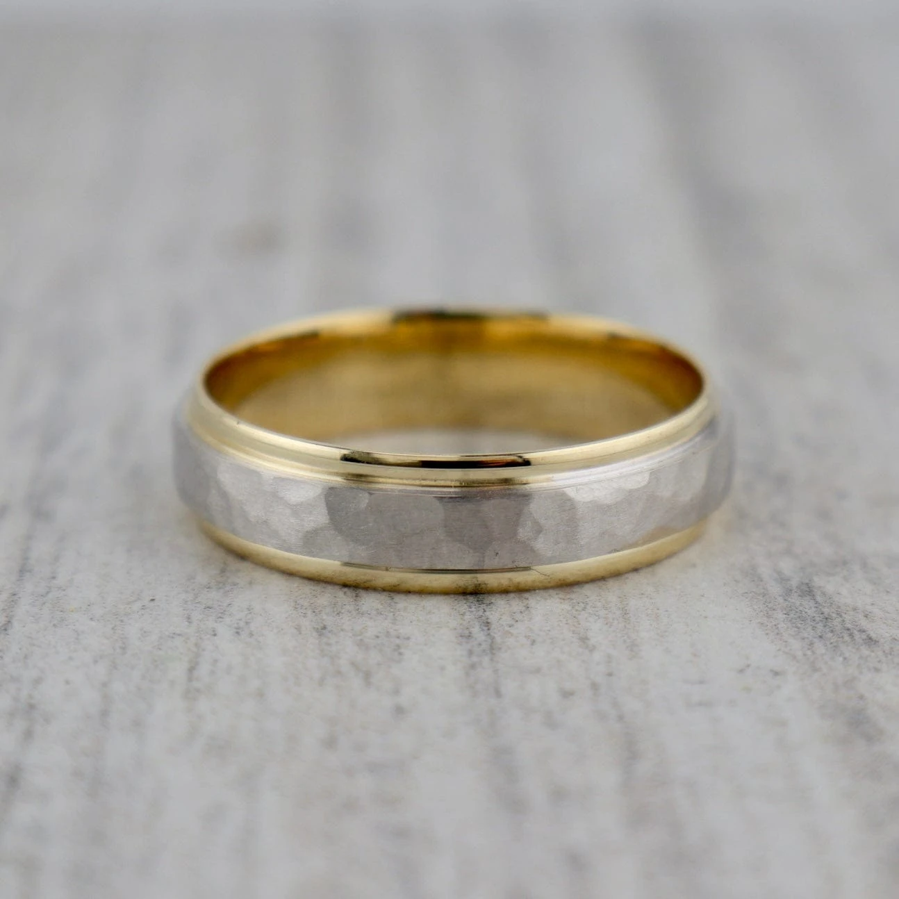 Bijou de toute une vie, ce jonc est fabriqué en or 10 carats. Conçu avec une base en or jaune, le jonc est visibilement majoritairement blanc avec sa partie centrale. Le mariage des deux tons ainsi que les deux finitions le rendent unique. En effet, au centre de ce jonc 7 mm se retrouve un fini martelé d’aspect mat alors que ses bordures sont polies et brillantes. Ce magnifique jonc de mariage est considéré confortable avec son intérieur fini arrondi.