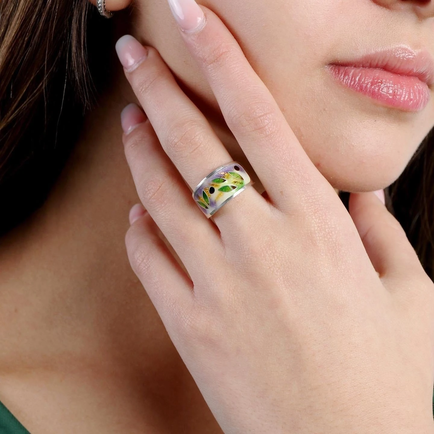 Bague en argent fin (999) ornée d’un motif en émail cloisonné, inspirée de l’olivier. Les feuilles en or 24 carats accentuent la luminosité de la bague.