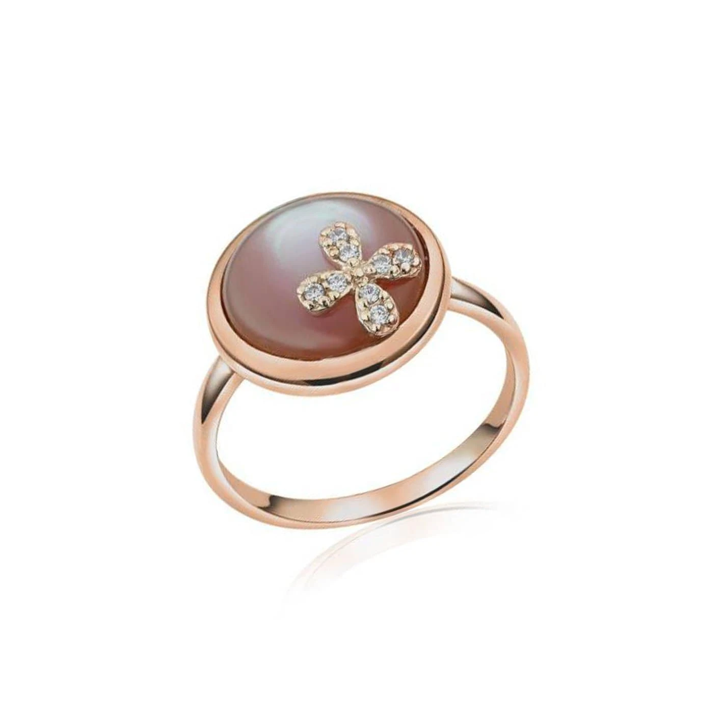 Bague en argent plaqué or rose avec nacre de perle rose et zircons cubiques.
