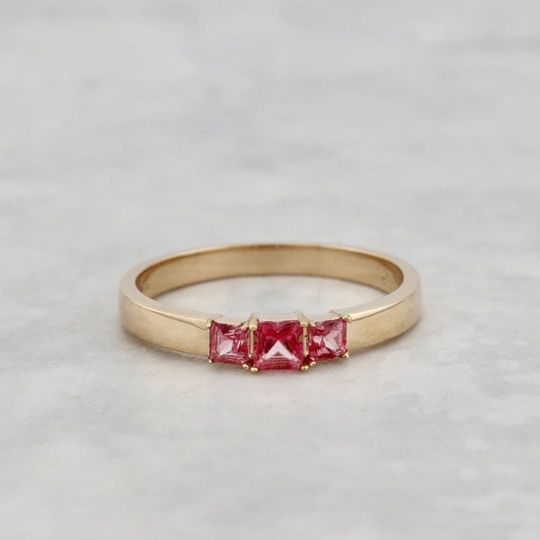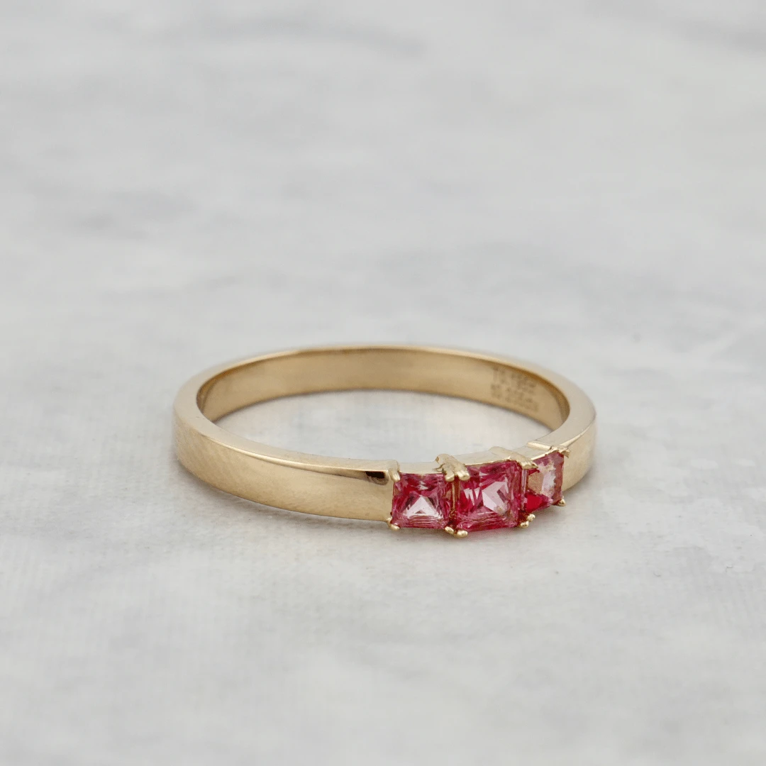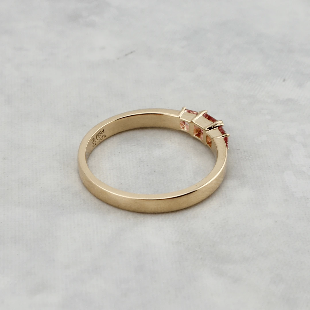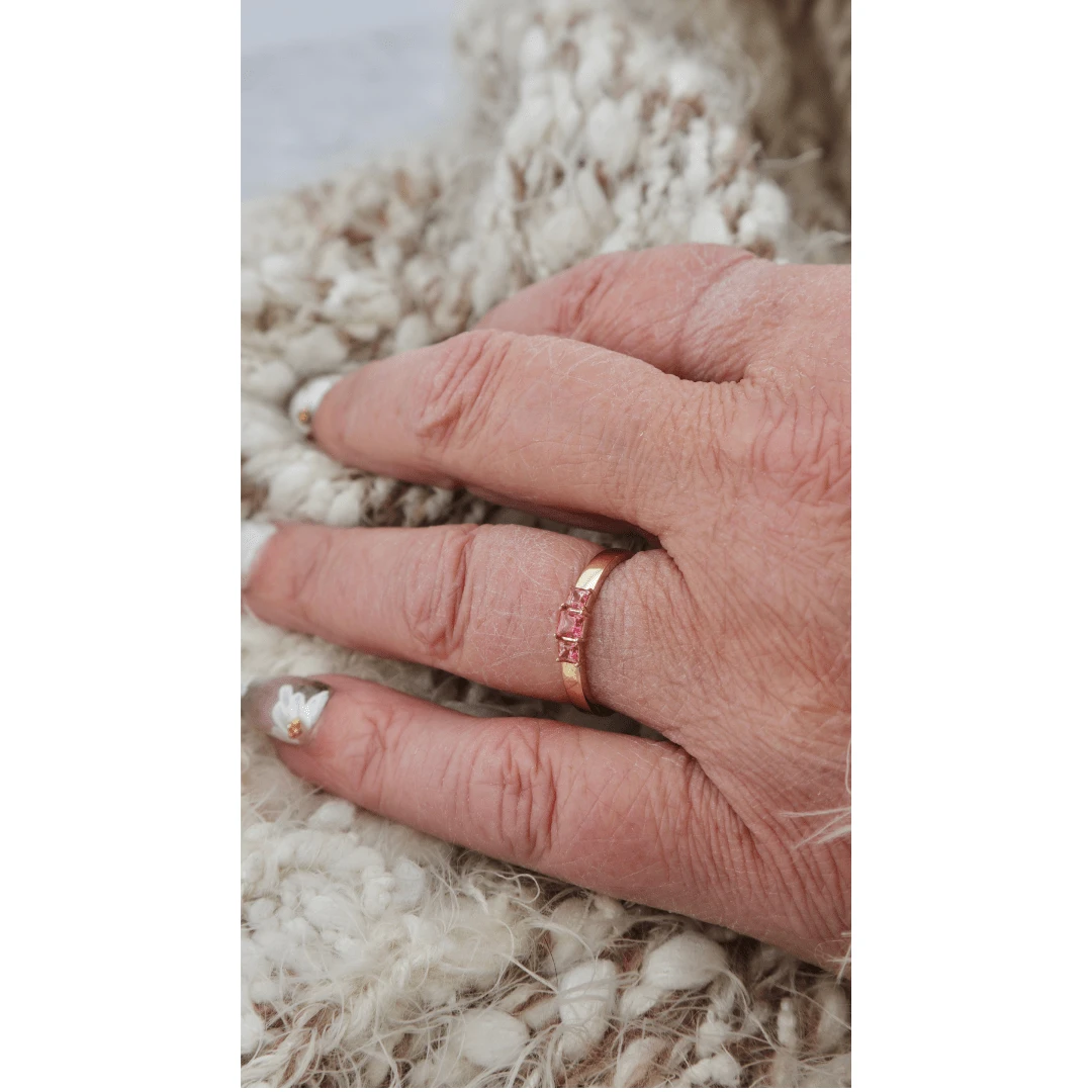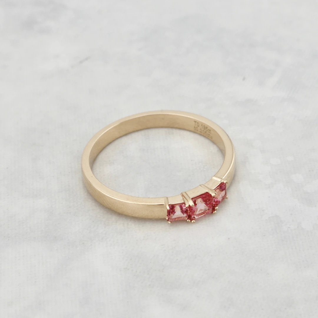Bague unique en or jaune 14K, de style jonc, ornée de trois topazes roses. La pierre centrale, taillée en princesse et mesurant 3,05 mm, est mise est valeur par deux pierres latérales légèrement plus petites. Ensemble, elles créent une composition à la fois délicate et harmonieuse.