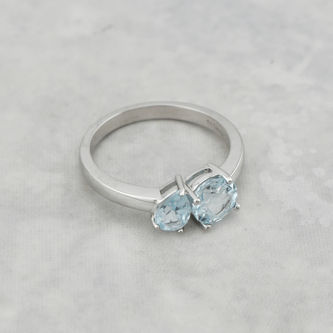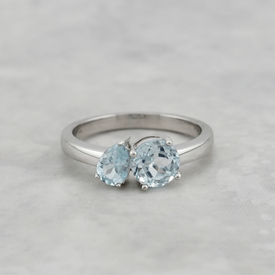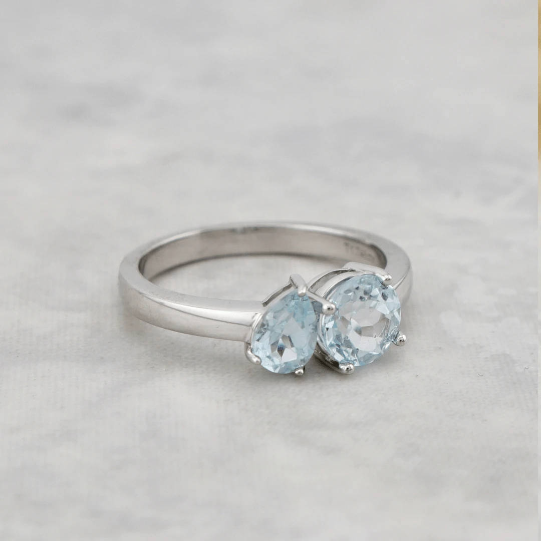 Cette bague unique en or blanc 14K met en valeur un design Toi & Moi intemporel, symbole de la connexion entre deux âmes. Les pierres, soigneusement sélectionnées pour leur harmonie, sont composées de topazes bleu clair : une pierre ronde et une pierre en forme de poire.
