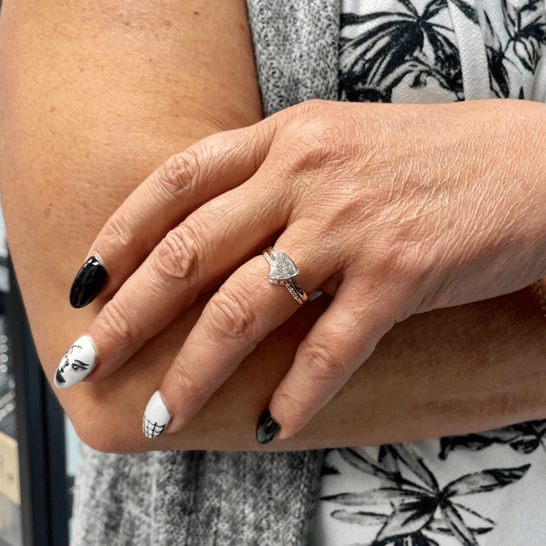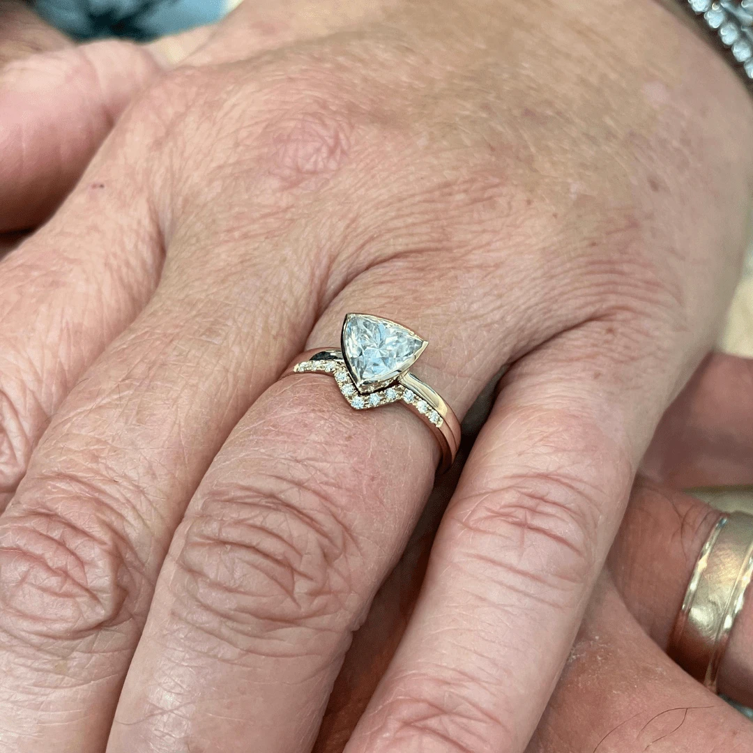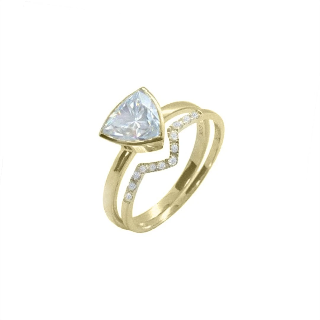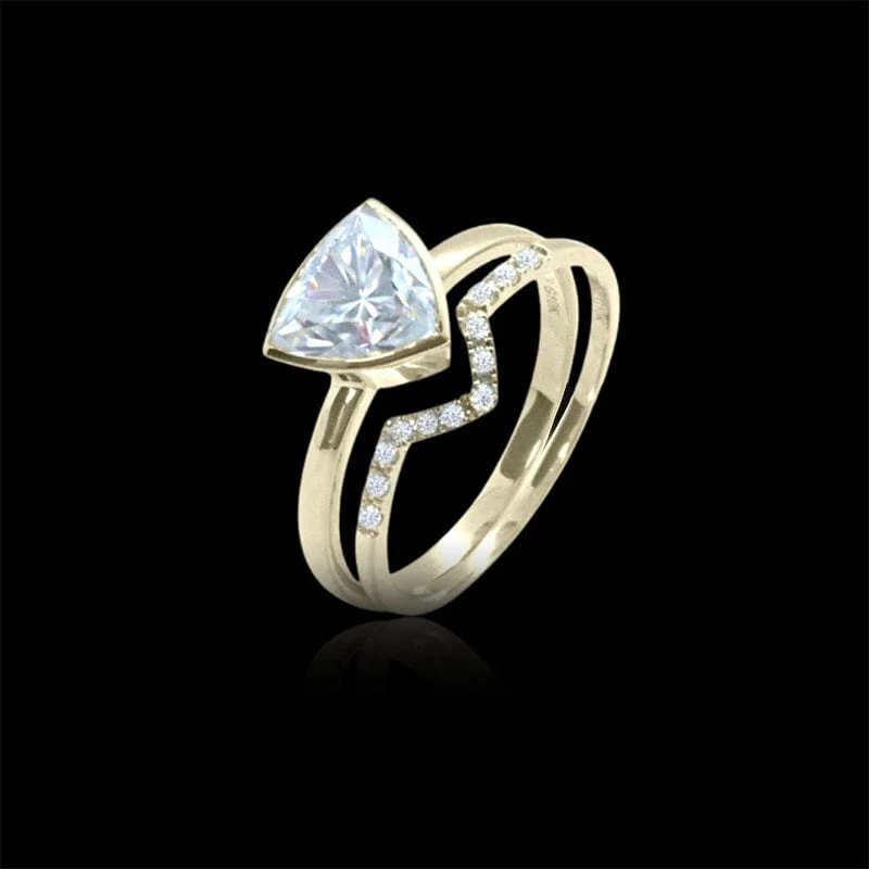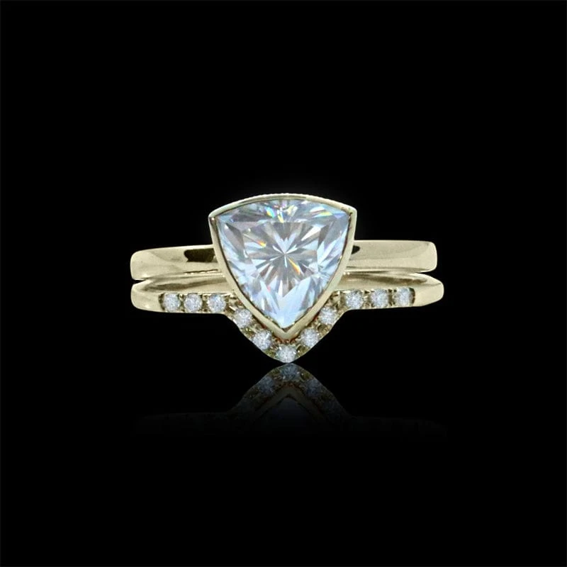 Dites-lui que votre cœur lui appartient avec ce duo de bagues solitaire et alliance exceptionnelle Mathieu Blanchard Signature. Conçu en or 10K, ce duo de bagues met en valeur 1 moissanite coupe trillion 7,5 mm (1.5 ct) et 11 moissanites 1 mm, conçue en laboratoire et serties sur griffes.