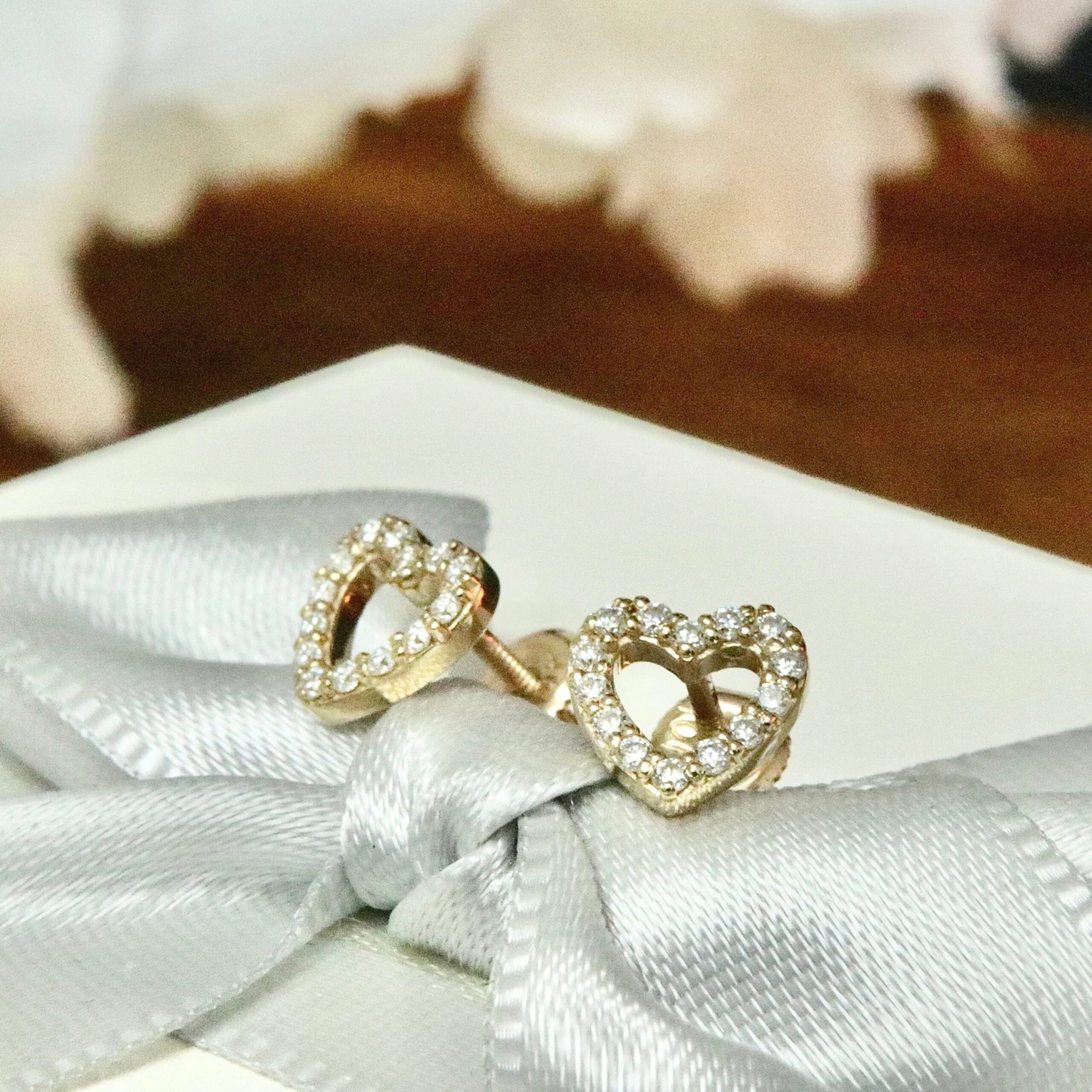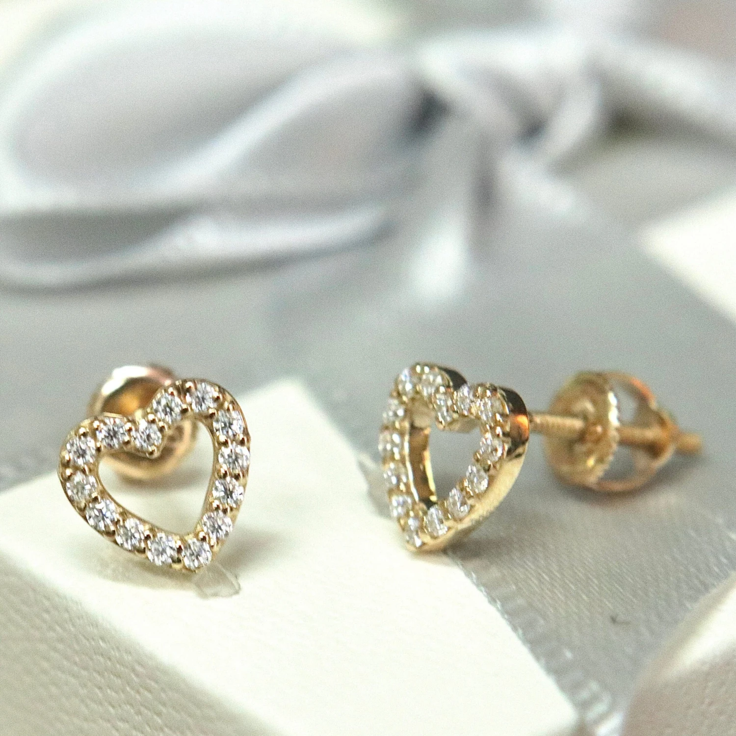 Paire de boucles d’oreilles Coeurs avec moissanites serties sur or jaune 10K, avec tiges et fermoirs vissés à l’arrière. Elles sont parfaites et confortables pour un enfant, mais également pour un adolescent ou adulte.