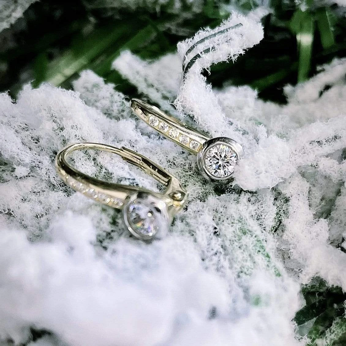 Paire de boucles d’oreilles de type levier ou leverback en or blanc 10K et/ou or jaune 10K. Chaque boucle fait briller un zircon cubique 4 mm serti, ainsi que cinq zircons cubiques 1 mm.