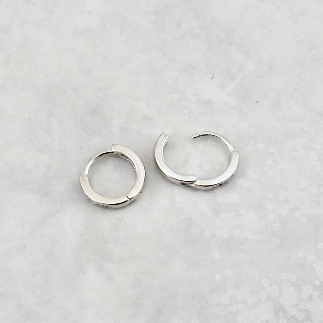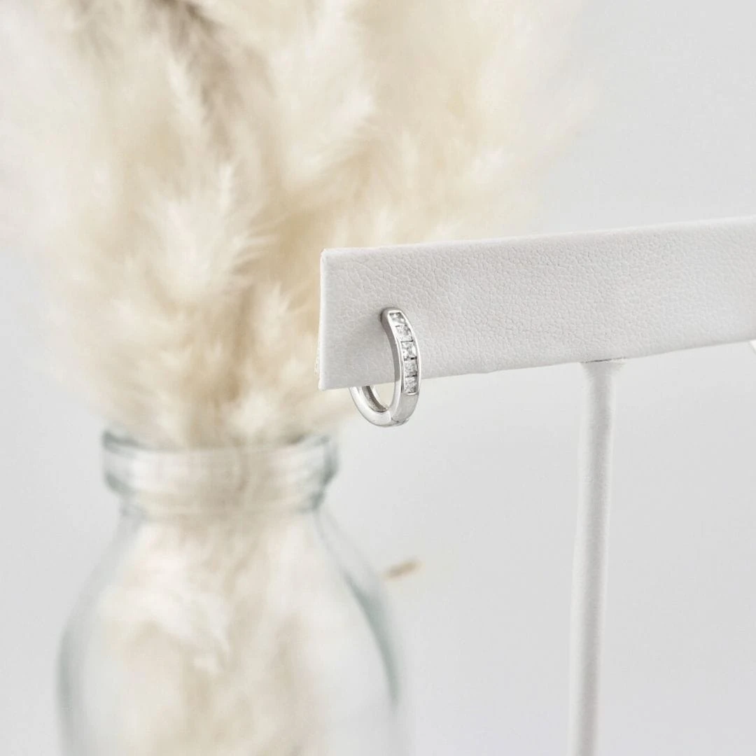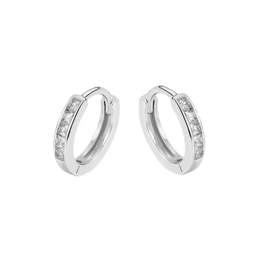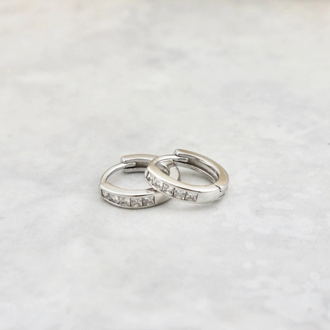 Boucles d’oreilles huggies avec zircons cubiques facettés princesse sertis sur argent sterling 925. Elles sont parfaites et confortables pour un enfant, mais également pour un adolescent ou adulte.