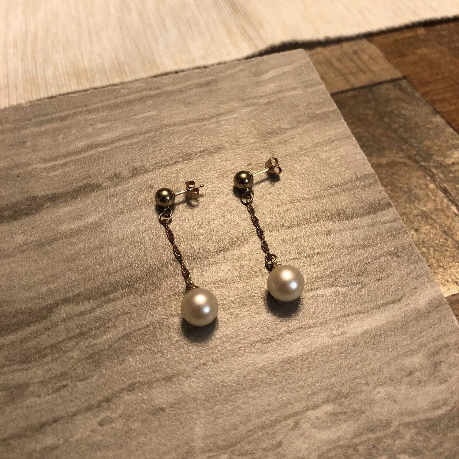 Boucles d’oreilles chaines en or jaune 14K et perles d’eau douce blanches 8mm de grade AAA.