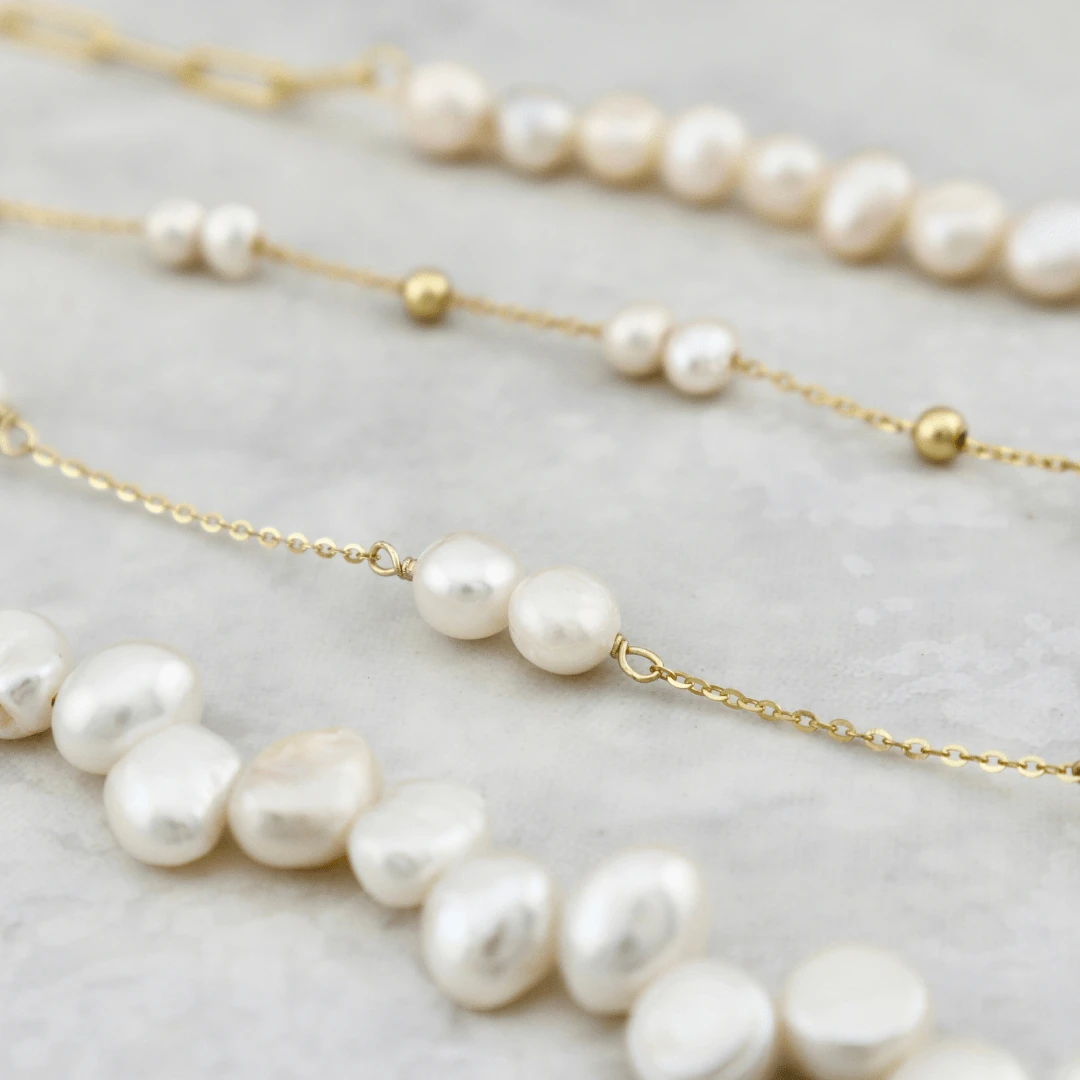 Les perles utilisées sont d’origine organique, présentant une variété de formes naturelles. Nous sélectionnons des perles baroques ou semi-baroques, dont les formes asymétriques ajoutent caractère et authenticité à chaque création.