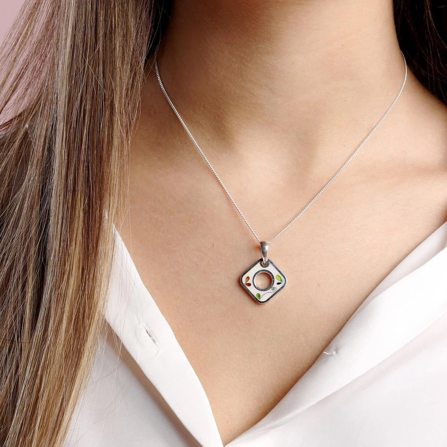 Le pendentif en émail cloisonné, avec son motif d’oiseau, est créé directement sur une base en argent sterling.