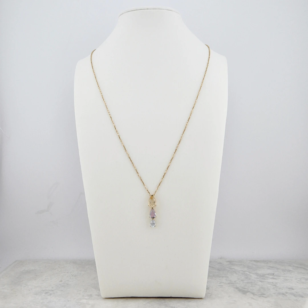 Ce collier unique en or jaune 14K met en valeur trois pierres en forme de poire, suspendues verticalement du plus grand au plus petit. Avec leurs teintes pastel délicates, ces pierres créent une harmonie douce et colorée.