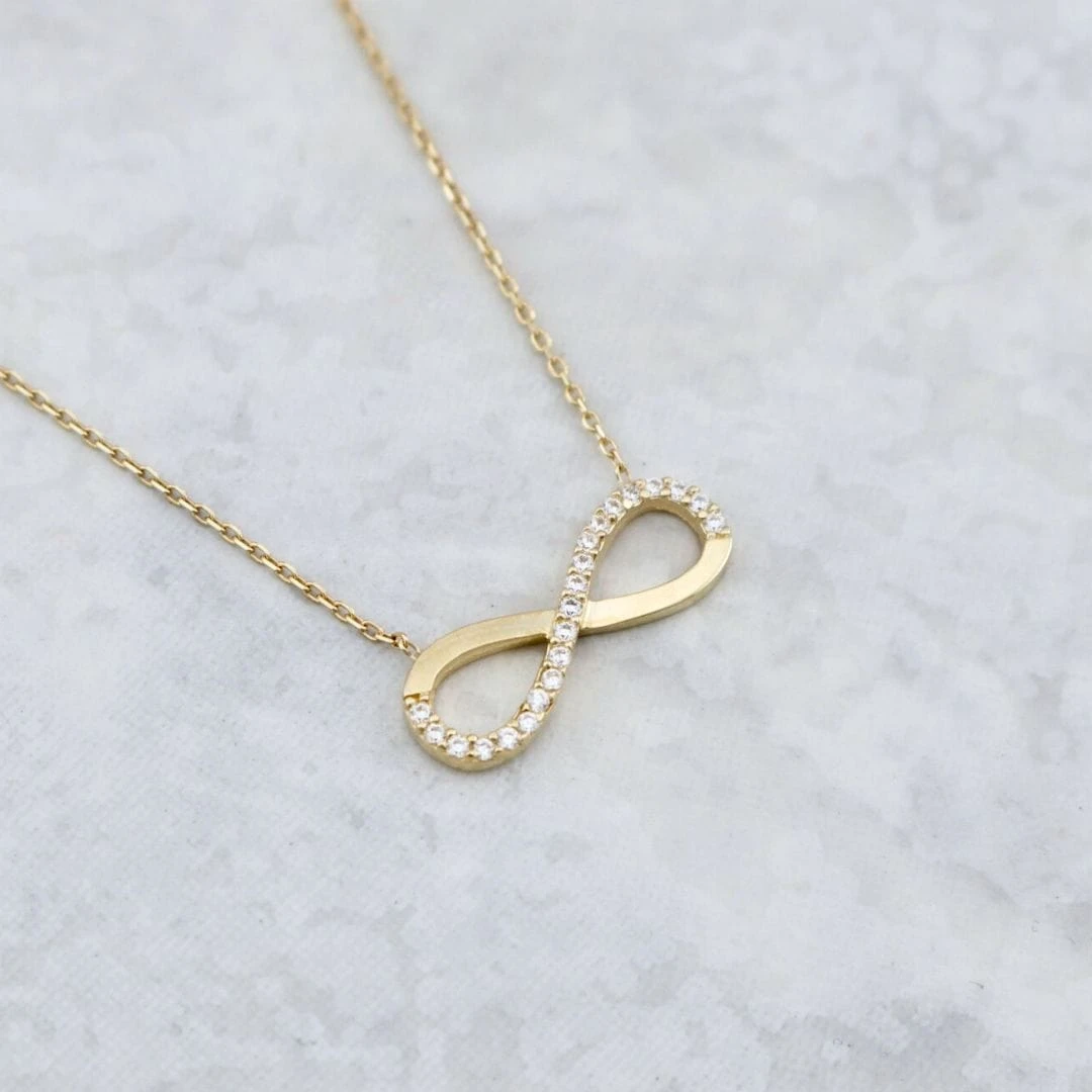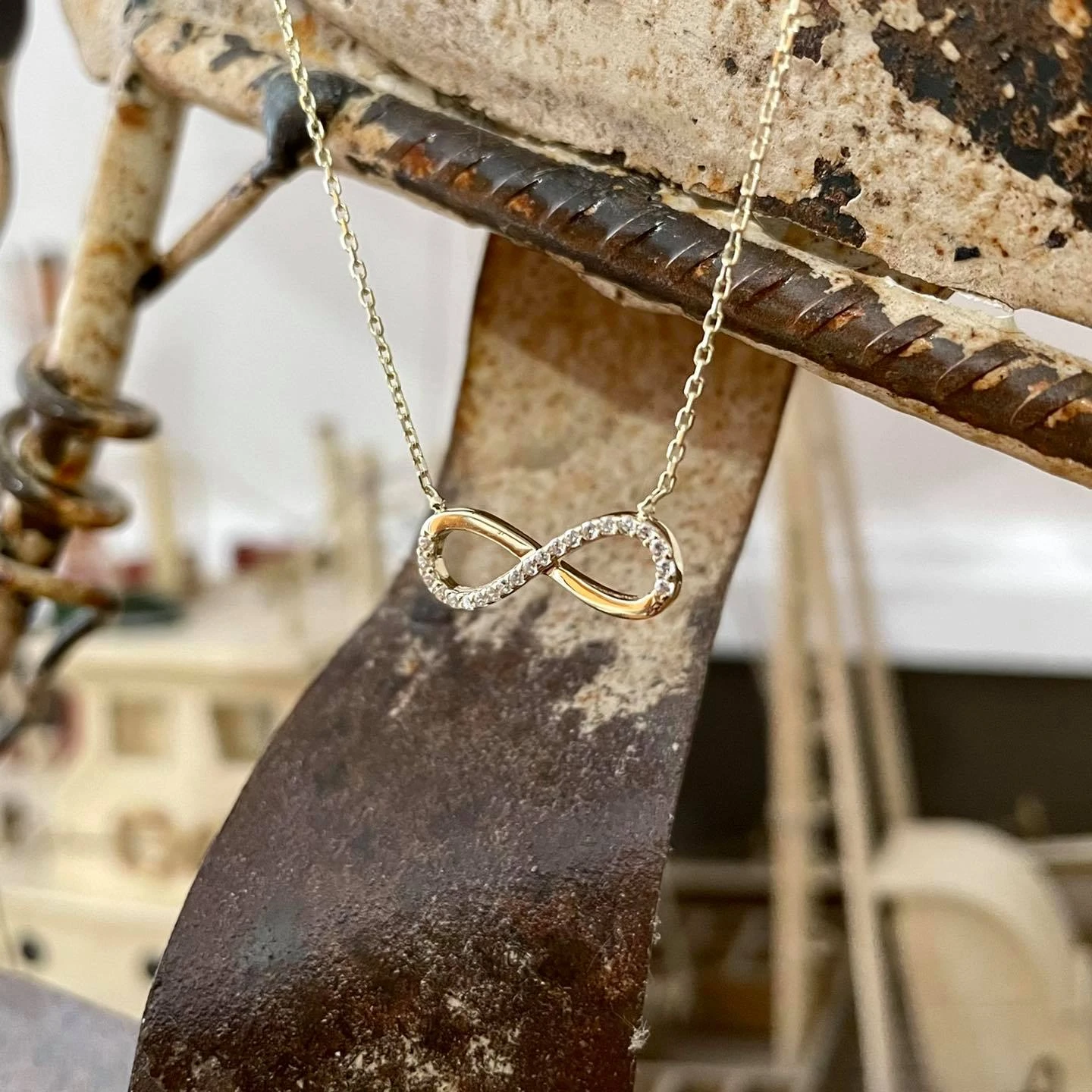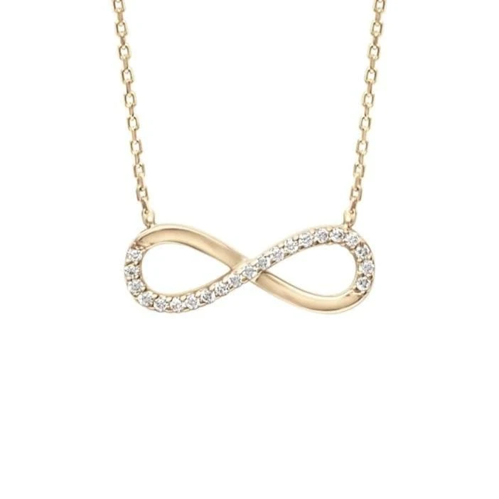 Ce collier en or jaune 10K présente un symbole de l’infini, offrant un design fluide et raffiné. Les pierres scintillantes ajoutent une touche d’éclat discret. Un bijou intemporel, idéal pour marquer un lien spécial ou comme cadeau significatif.