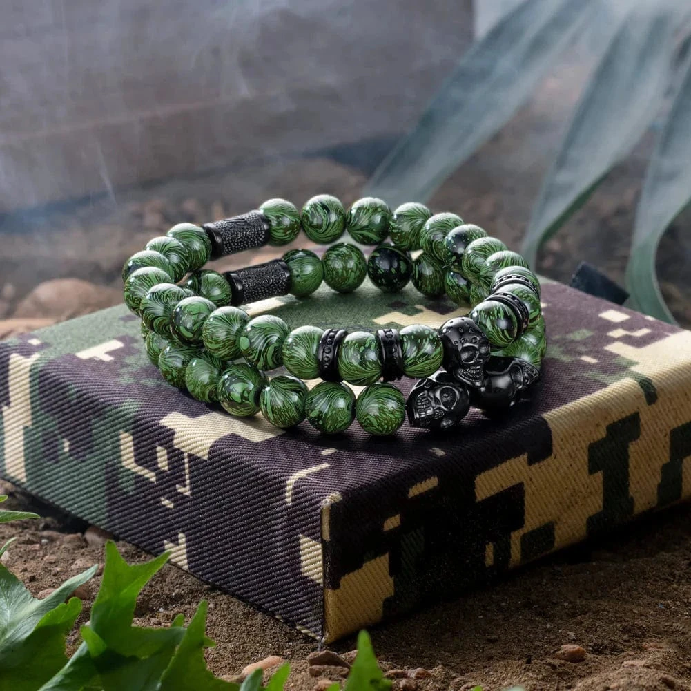 Inspirés du combat opérationnel, ce duo de bracelets reprennent les motifs des tenues de camouflage militaires. Ce design est réalisé grâce à un nouveau procédé qui met en valeur l’alliance parfaite de pierres vert forêt et noires. Ces crânes haut de gamme s’intègrent facilement à vos tenues ou se portent élégamment aux côtés d’une montre.