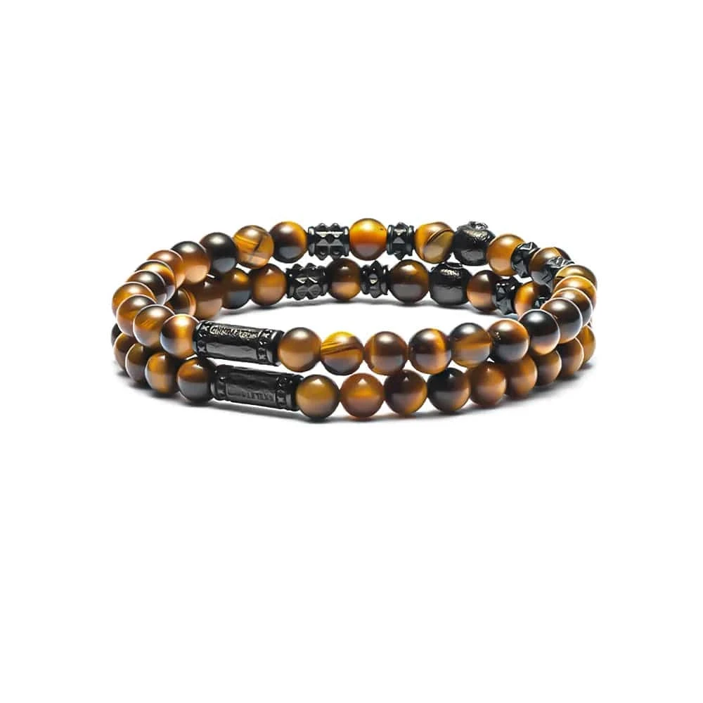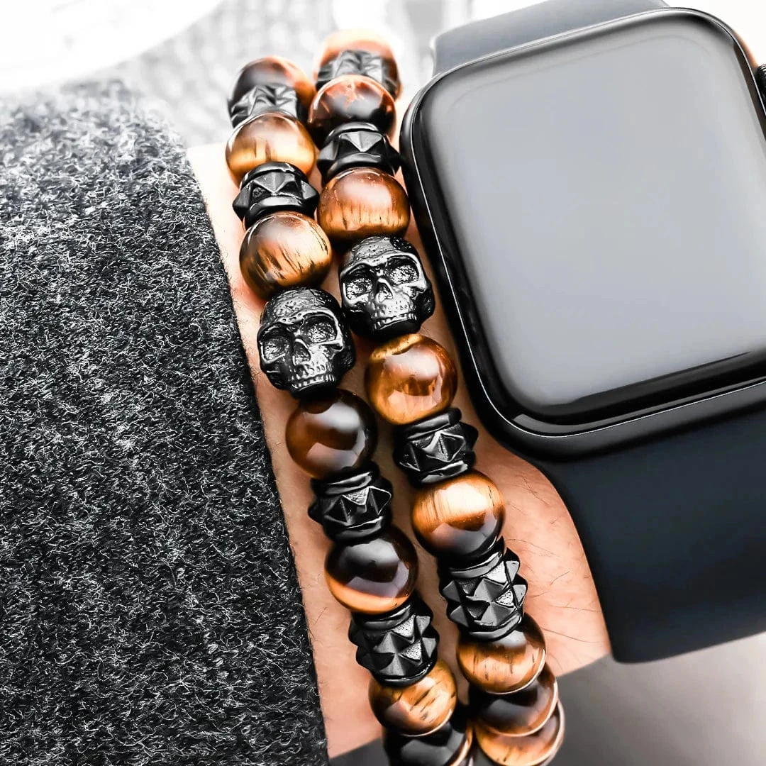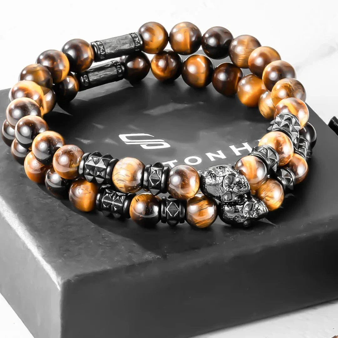Duo de bracelets en acier inoxydable alliant élégance et robustesse. Chaque bracelet est orné d’un crâne noir et de billes en pierres naturelles œil de tigre. Légers et solides, ils complètent facilement un style contemporain.