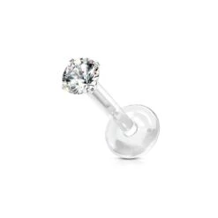 Piercing de type labret, pour la lèvre, l’hélix et le tragus, avec une tige en bioflex et un embout (qui se clipse à l’intérieur de la tige) en acier inoxydable 316L serti d’une pierre ronde en zirconium blanc.