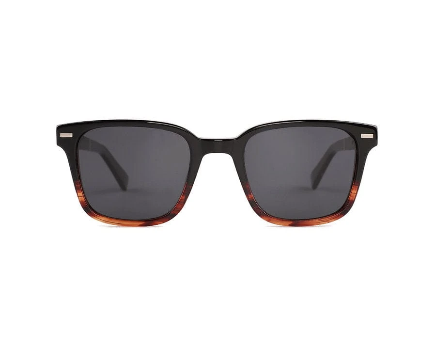 - Monture: acétate bicolore (noir-ambré) + épingles métalliques