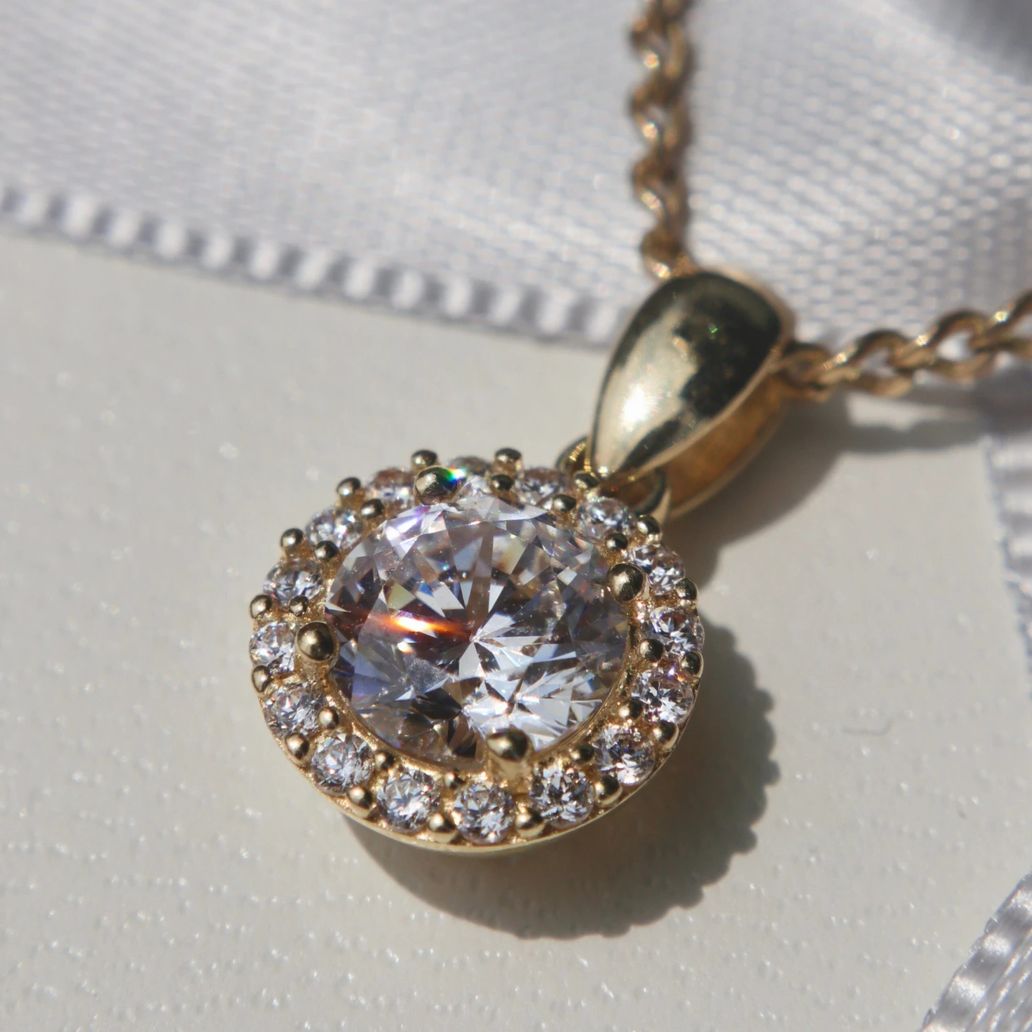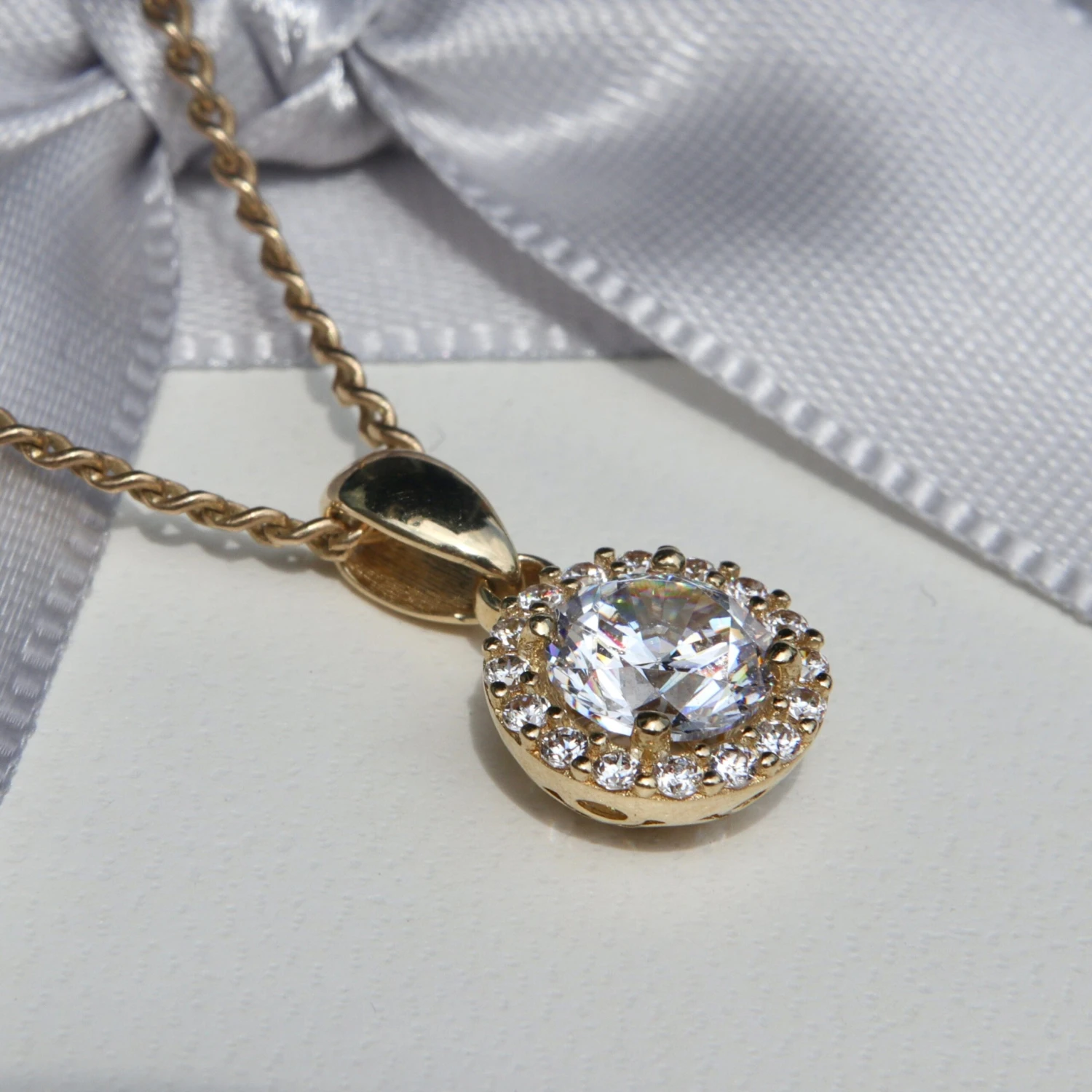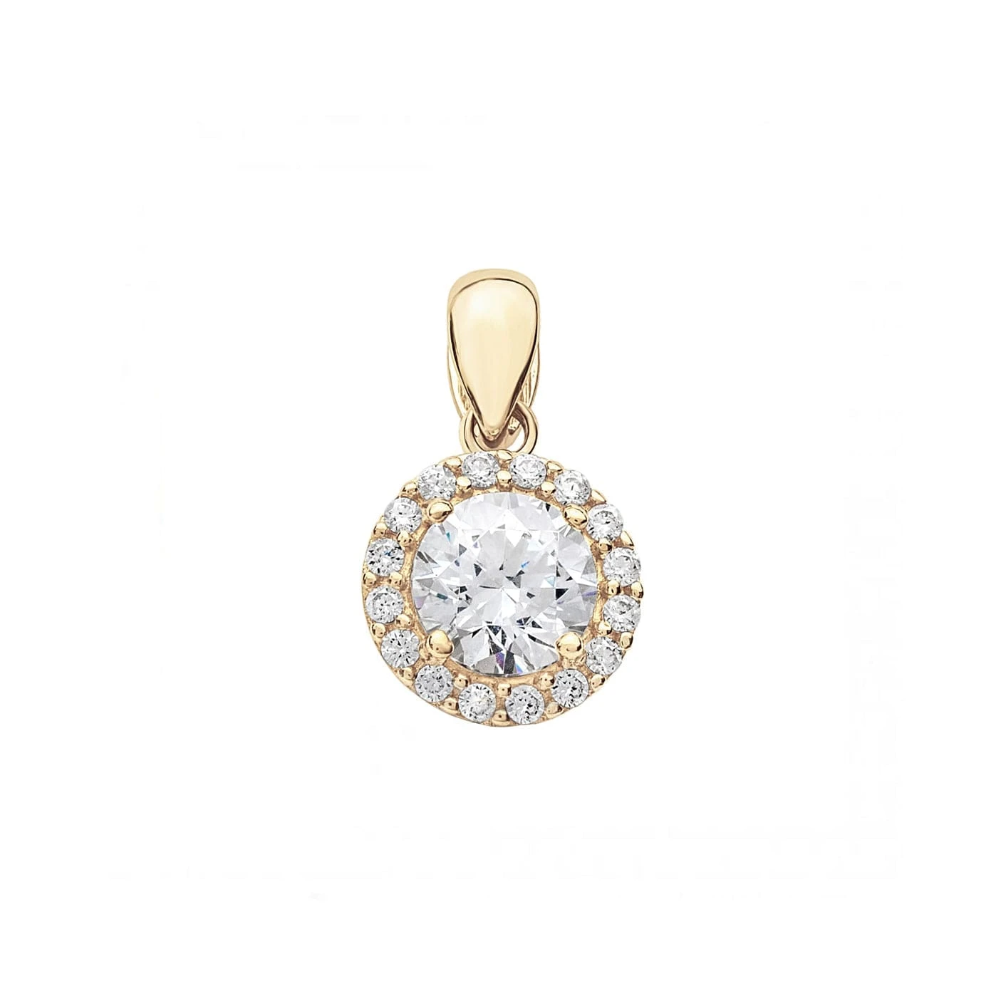 Le pendentif Éclat , conçu en 10K, est une pièce classique et intemporelle. Le zircon cubique est entouré de scintillantes pierres, lui donnant une magnifique luminosité.