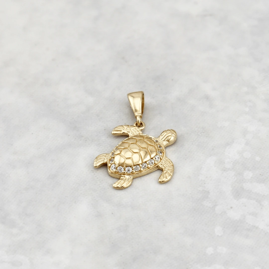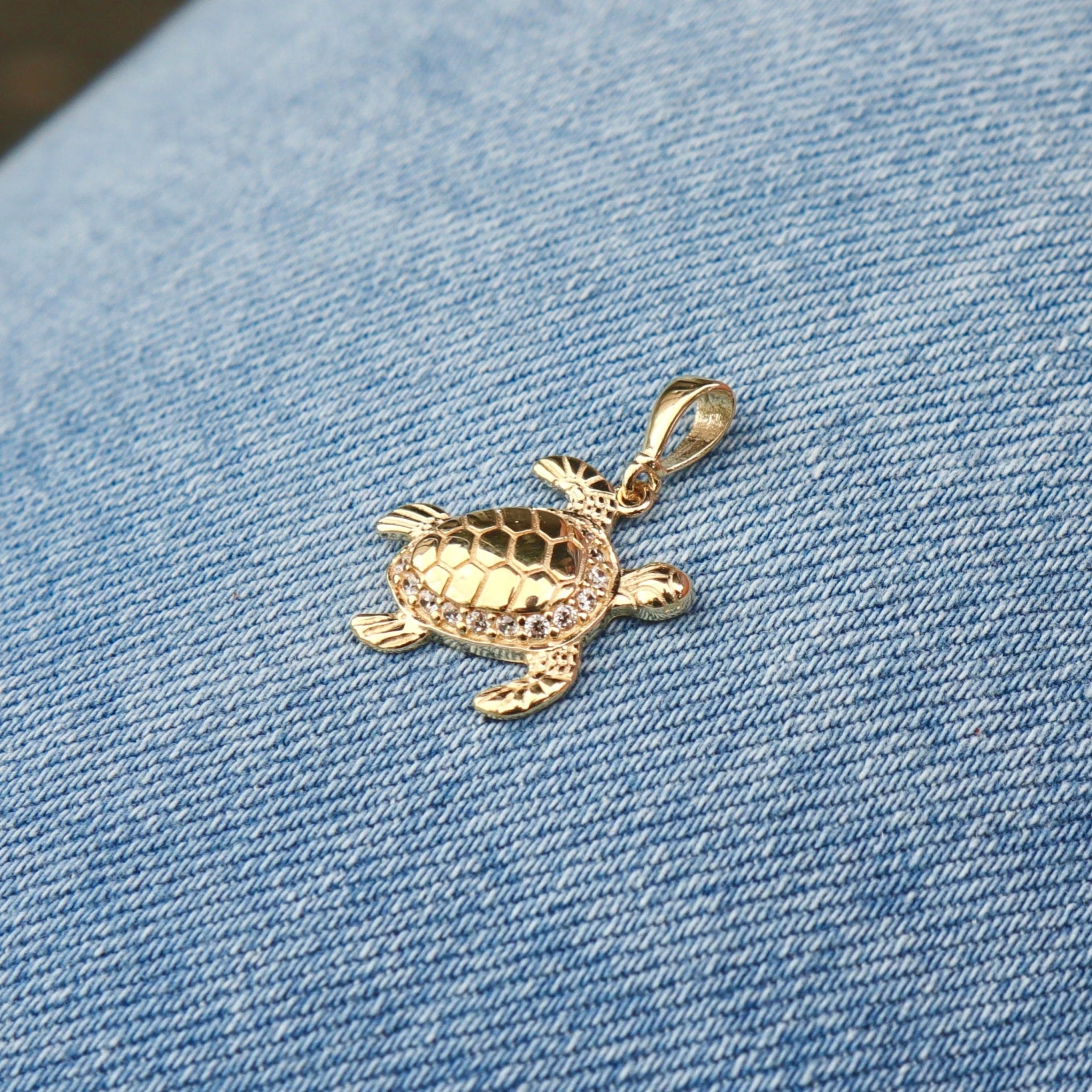 Pendentif en or 10K au design stylisé de tortue, avec une carapace lustrée et un contour pavé de petites pierres claires. Un bijou compact, éclatant et facile à porter — idéal pour compléter un look estival avec une touche de brillance..