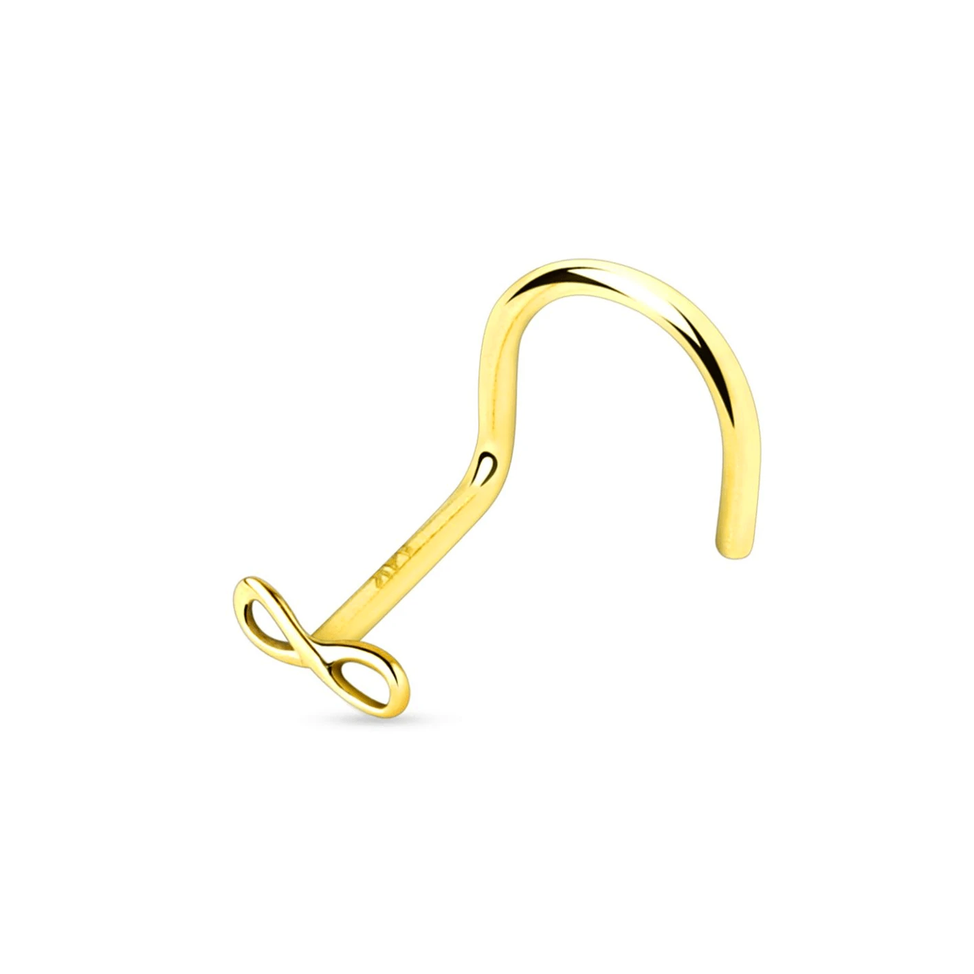 Piercing de nez infini sur tige 20g en or jaune 14K qui s’intégrera parfaitement dans un piercing de nez. L’infini a une largeur de 5mm.