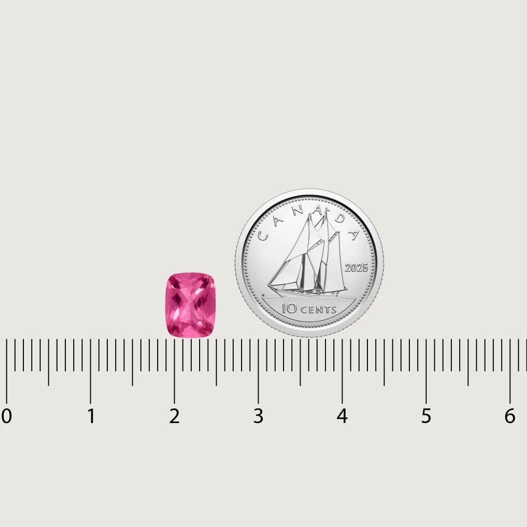 Cette topaze rose a reçu un traitement par coating (revêtement). Il s’agit d’une fine couche appliquée sur la surface de la pierre, généralement au verso, pour modifier ou intensifier sa couleur. Ce traitement est esthétique, mais il est moins durable que d’autres méthodes comme le chauffage ou l’irradiation. Des frottements répétés, des produits chimiques ou une exposition prolongée à la chaleur peuvent endommager le revêtement et altérer l’apparence de la pierre. Ce type de traitement doit être mentionné pour assurer une transparence complète.