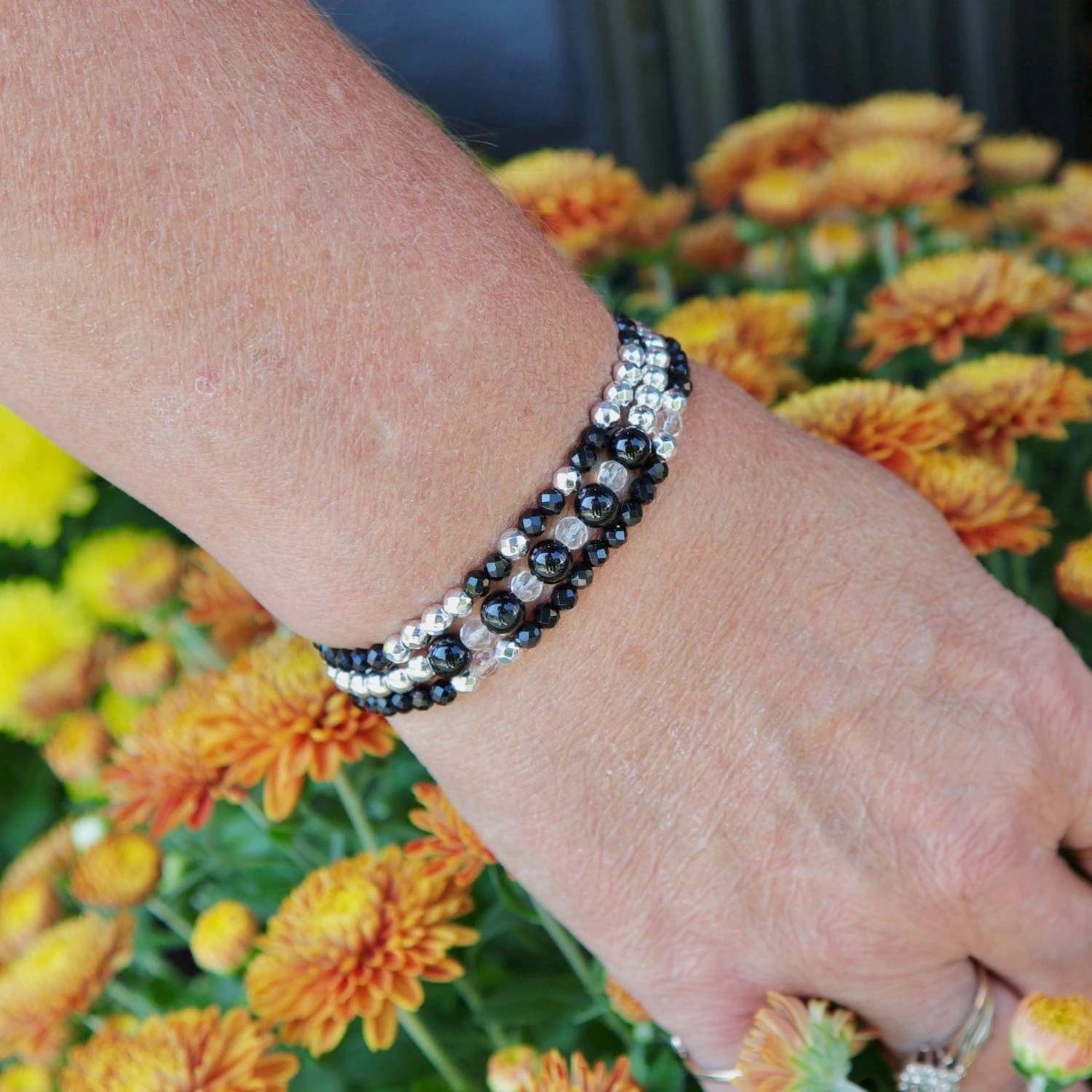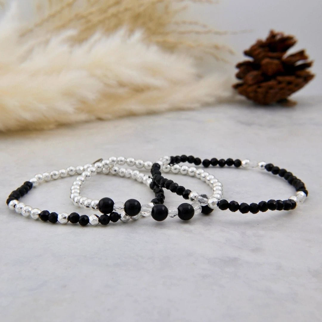 Trio de bracelets associe l’hématite plaquée argent et l’onyx noir, créant un contraste subtil entre lumière et ombre. Montés sur un fil élastique durable, ces bracelets sont faciles à porter et ajoutent une touche élégante à votre quotidien.