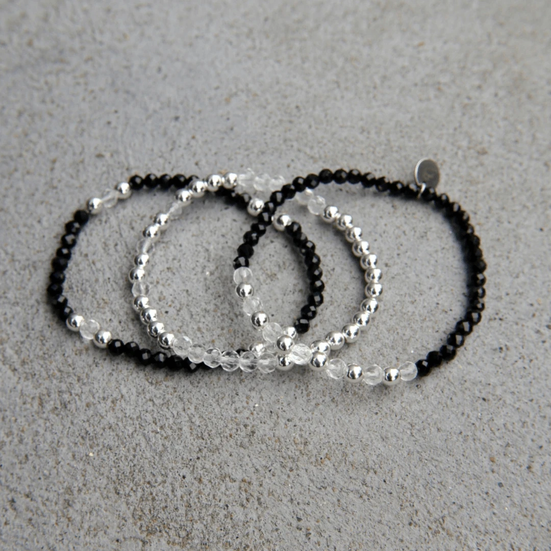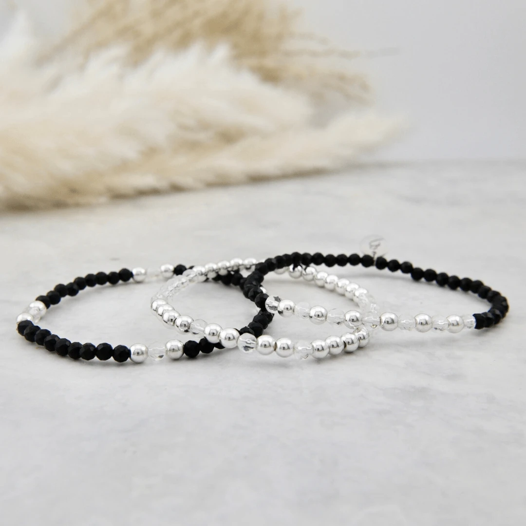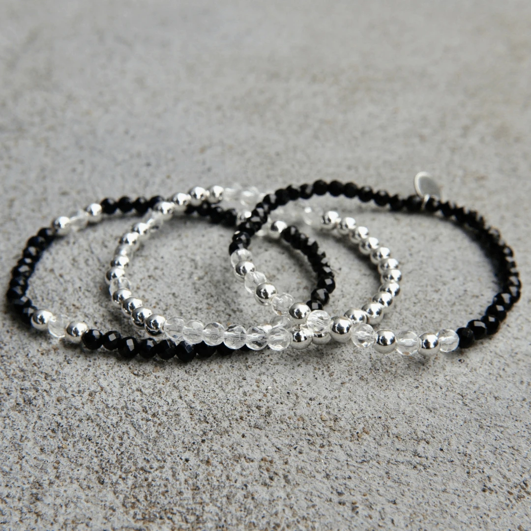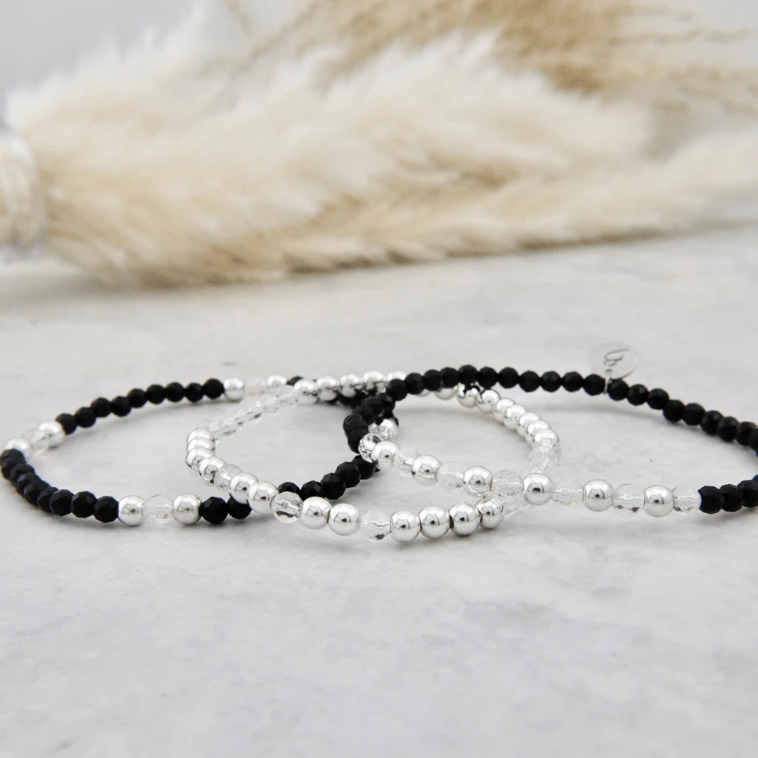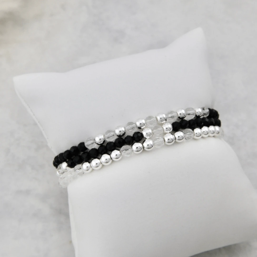 Trio de bracelets associe l’hématite plaquée argent et l’onyx noir, créant un contraste subtil entre lumière et ombre. Montés sur un fil élastique durable, ces bracelets sont faciles à porter et ajoutent une touche élégante à votre quotidien.